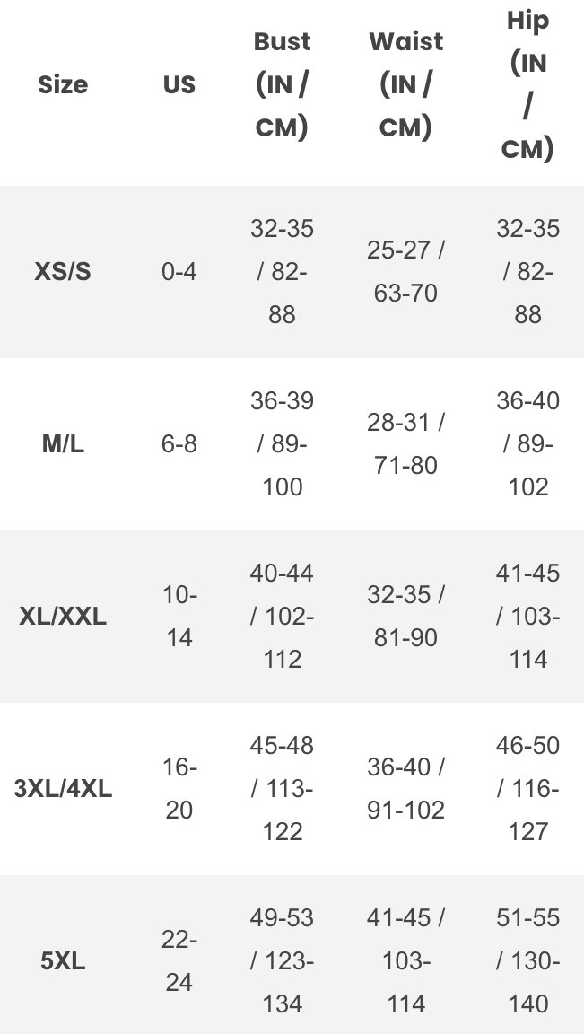 XS/S, M/L, XL/2XL, 3XL/4XL, 5XL